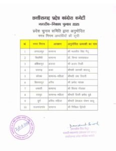 रायपुर। छत्तीसगढ़ में निकाय चुनाव के लिए कांग्रेस ने भी अपने प्रत्याशियों की सूची जारी कर दी है।
