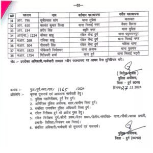 दुर्ग पुलिस ट्रांसफर इंस्पेक्टर व सब इंस्पेक्टर समेत 38 पुलिसकर्मियों का तबादला