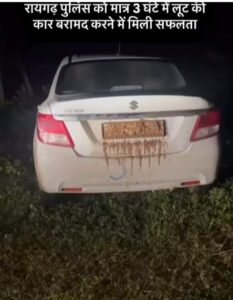 रायगढ़ पुलिस को मात्र 3 घंटे में लूट की कार बरामद करने में मिली सफलता…..