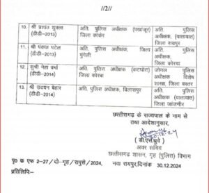 6. वैष्णव (र.नि.-2009): अतिरिक्त पुलिस अधीक्षक, राज्य पुलिस अकादमी, चंदखुरी से अतिरिक्त पुलिस अधीक्षक, एसटीएफ बघेरा, दुर्ग।